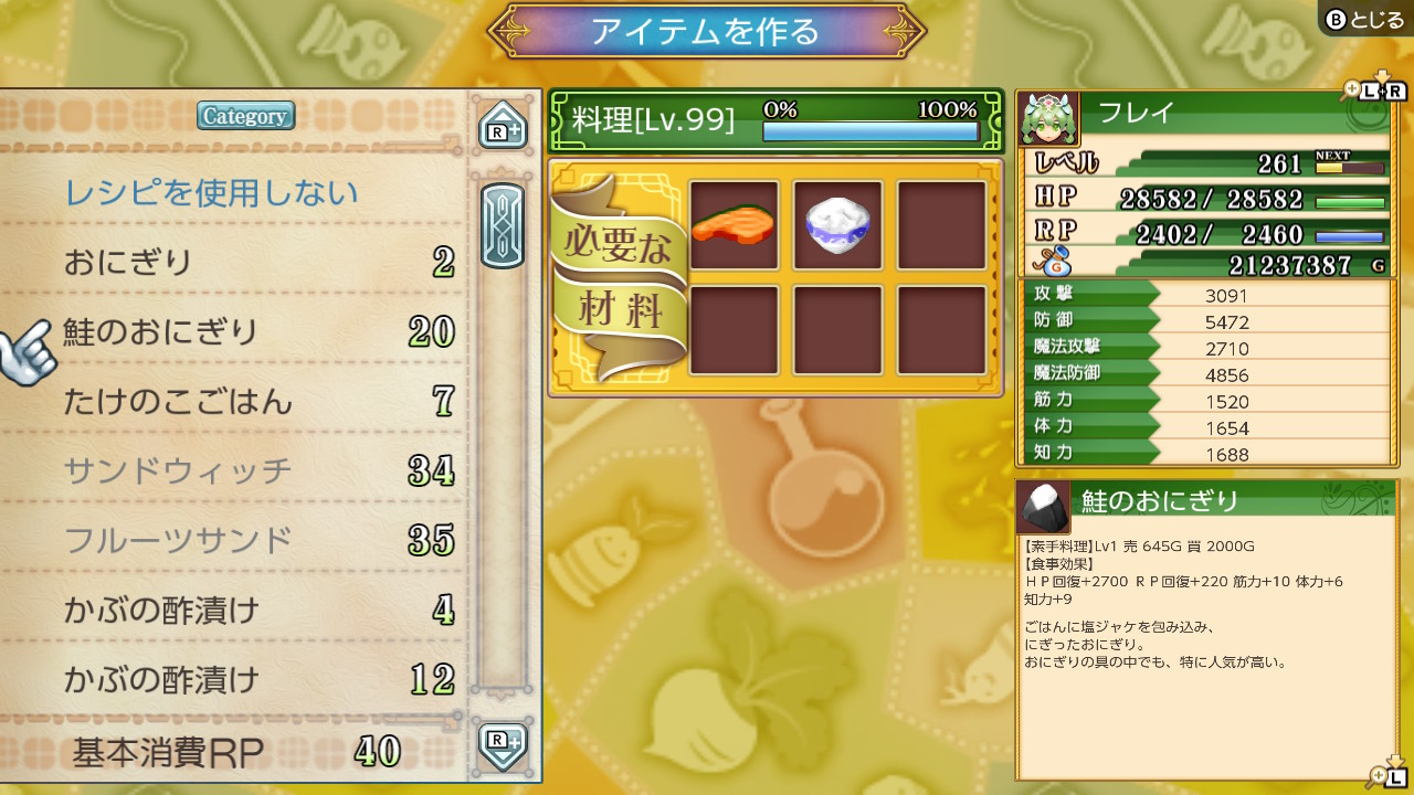 ただしこのゲームに限ったことではないが、鮭1匹=料理1回分なので毎日鮭のおにぎりを食べるためには相応の努力が必要である。
